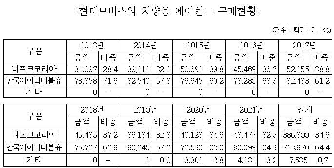 공정거래위원회는 외국계 자동차 부품업체인 (주)니프코 코리아와 한국아이티더블유(유) (일본 Nifco Inc., 미국 Illinois Tool Works Inc.)가 현대모비스 및 크레아에이엔(케이지모빌리티(舊쌍용자동차)에 에어벤트 부품 모듈을 공급하는 협력사)이 발주한 차량용 에어벤트 부품 입찰에서 2013년 10월부터 2021년 3월까지 7년 6개월 동안 사전에 낙찰예정자, 투찰가격 등을 담합한 행위에 대해 시정명령과 함께 과징금 총 354억 1,700만 원을 부과하고 이들 양사를 고발하기로 결정하였다.