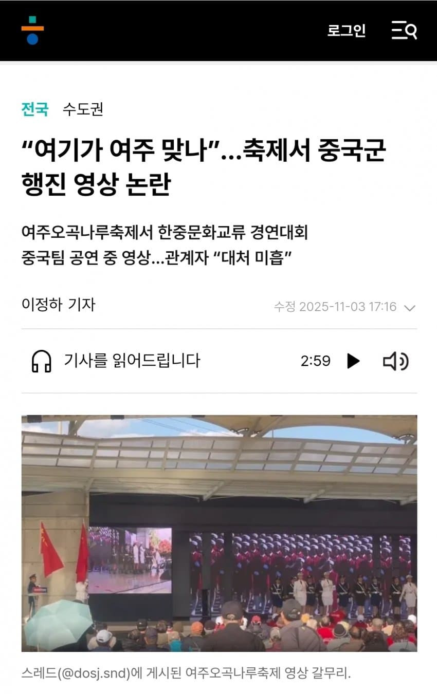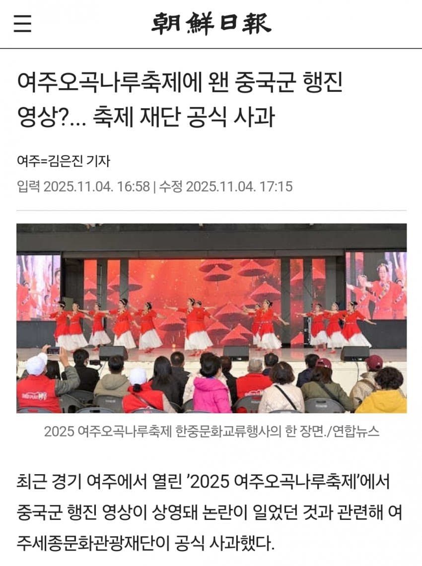 도대체 여주 오곡나루축제와 중국군 행진, 중국군 군기와 군가, 중국 무용수 공연이 무슨 연관이 있는건지 모르겠노 ㅋㅋㅋㅋ