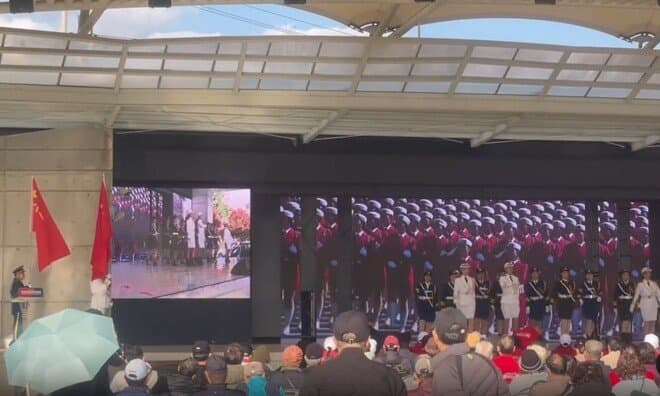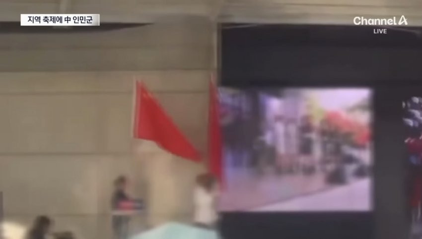 뜬금없이 행사 도중 중국 무용수 공연과 중국 인민 해방군 (중국군) 행진 장면 상영이 시작되고
