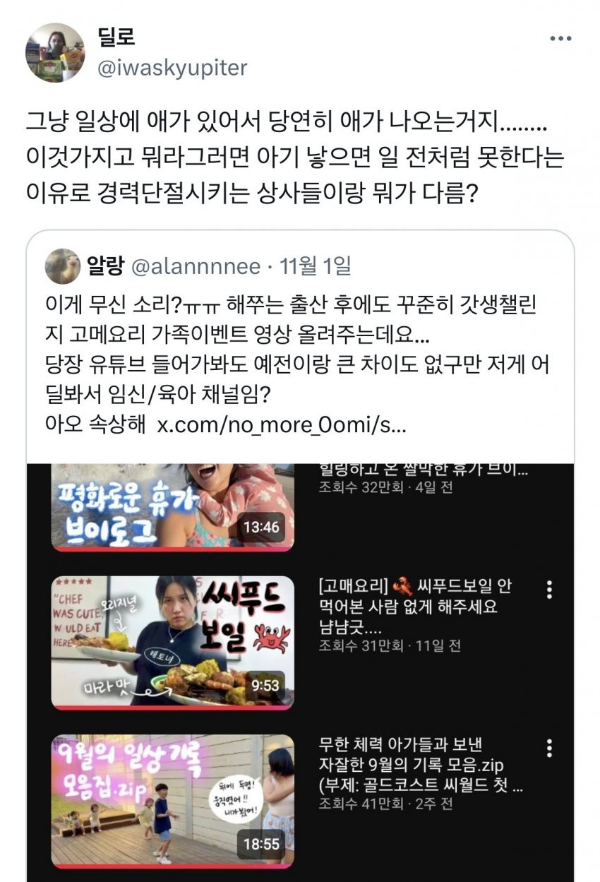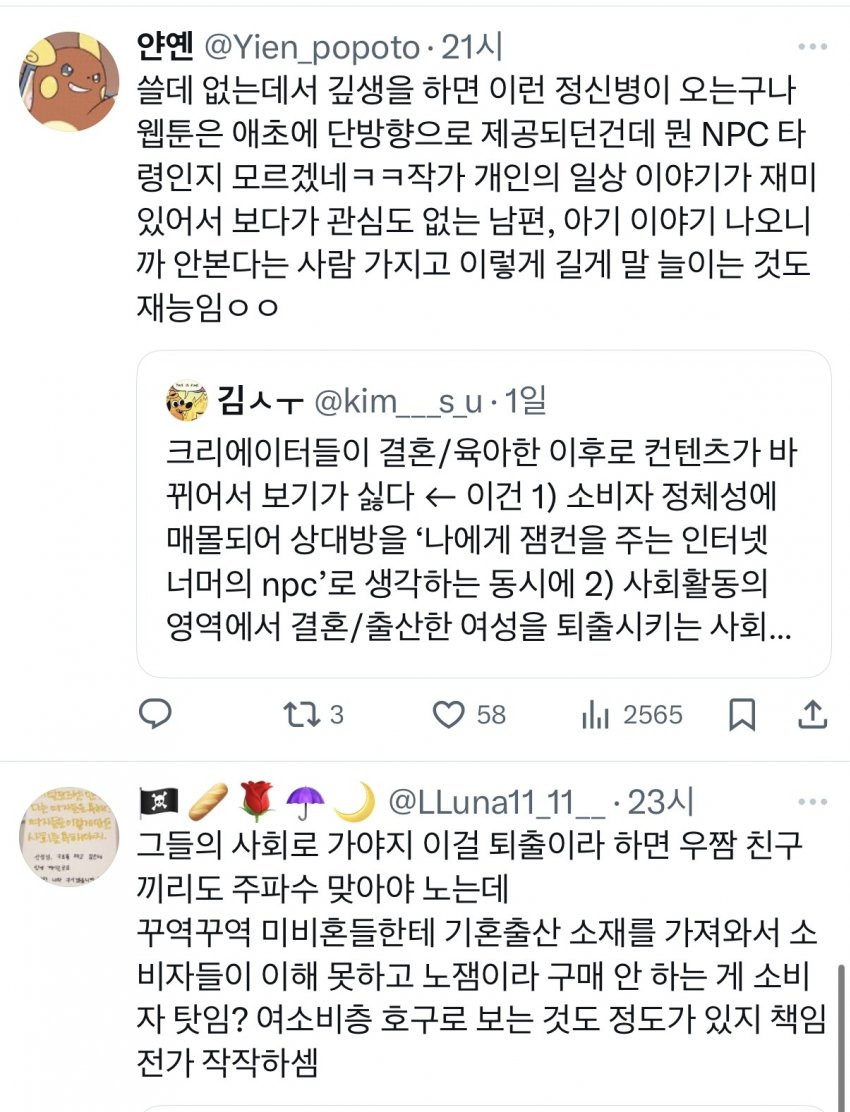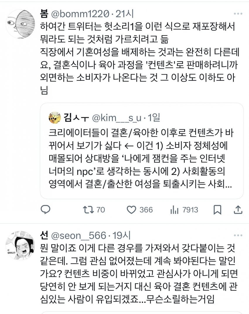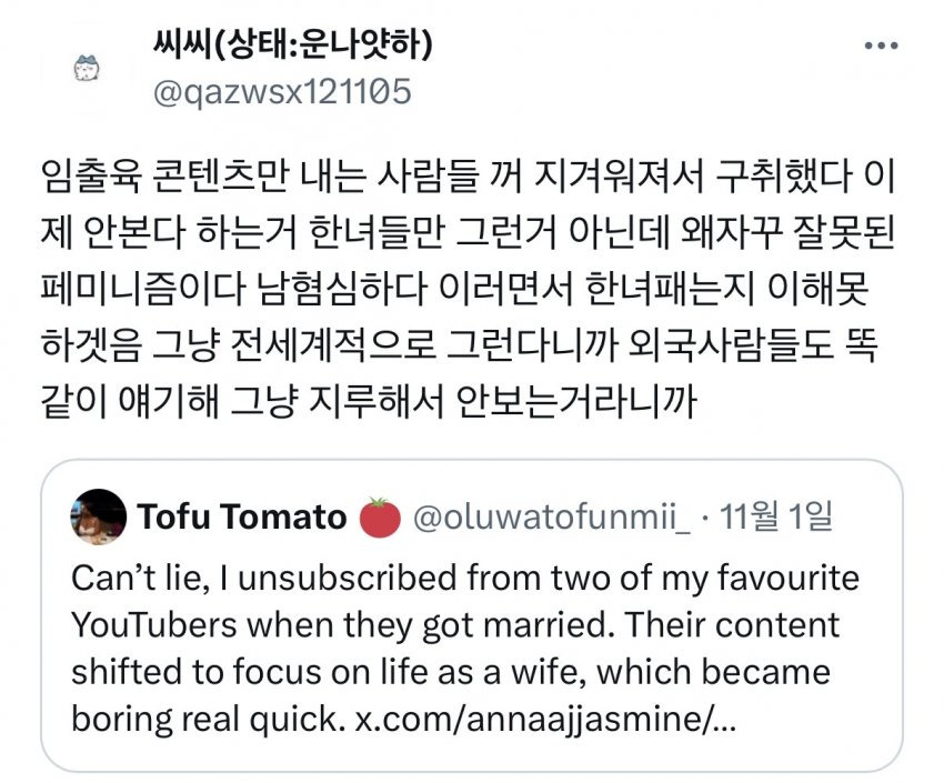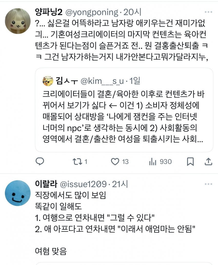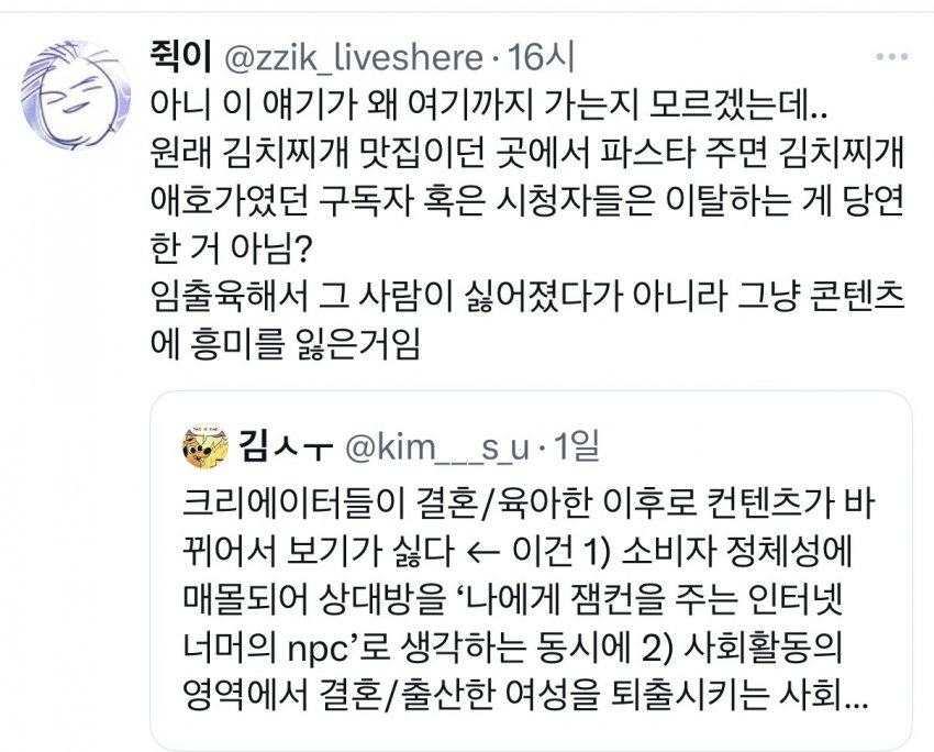 여성창작자들의 결혼후 육아컨텐츠를 보기 싫어하는 것은 여혐일까