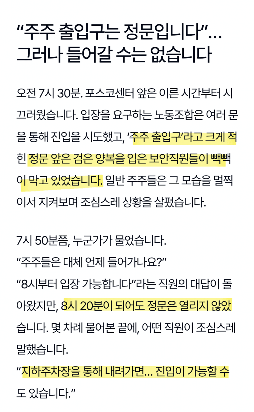 이번에도 건물 앞에 경비 깔아놓고 못들어가게 막았다고 한다